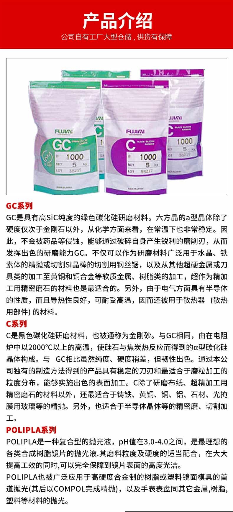 C 系列:目前公开资料中关于福吉米 C 系列绿色碳化硅研磨材料的详细信息较少,仅知其与 GC 系列同属高纯度绿色碳化硅研磨材料,可能在粒度分布、应用场景等方面与 GC 系列有所差异。