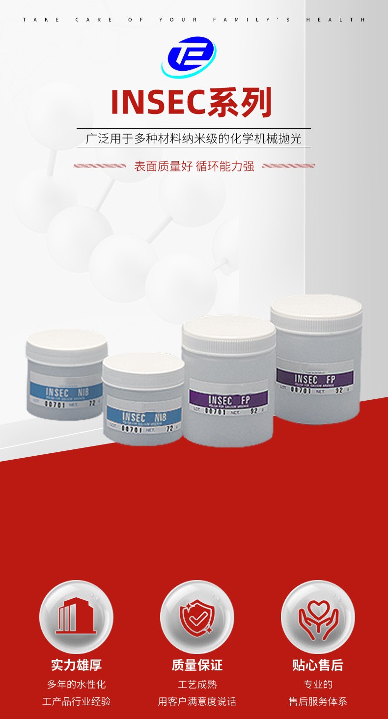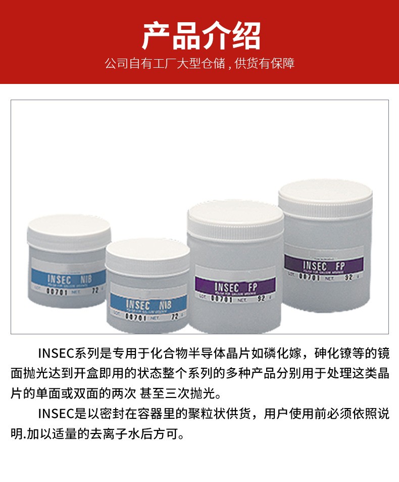 产品基础背景:该系列由日本不二见(FUJIMI,中文常称福吉米)研发,早在 1975 年福吉米就针对性开发出了砷化镓衬底片精抛抛光相关的 INSEC 系列产品,填补了化合物半导体精密抛光材料的需求空白,历经多年迭代,成为半导体加工领域中该类材料抛光的常用产品针对性强:专门匹配砷化镓、磷化铟等化合物半导体的理化特性。这类材料硬度、脆性特殊,普通研磨粉易造成表面划痕或损伤,而该系列研磨粉能适配其特性,减少加工缺陷。